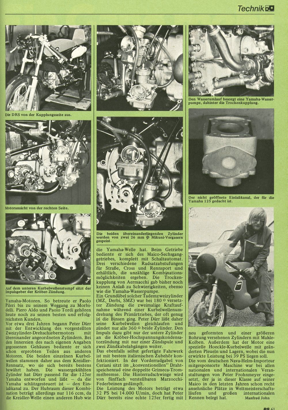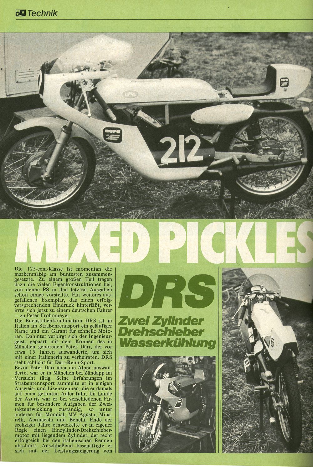 Daraufhin unterbreitete er mir ein alternatives Angebot: die Teilnahme an den ersten italienischen Frühjahrsrennen 1976 mit seiner eigenen DRS 125-ccm-Zweizylinder-Rennmaschine, die er in seiner Werkstatt in Calderino bei Bologna konstruiert und gebaut hatte. Das Fahrwerk war von Spezialisten in Bologna angefertigt worden. (Bei technischen Fragen arbeitete Dürr damals auch mit den Brüdern Walter und Francesco Villa zusammen.) Mit dieser Zweizylinder-DRS war Paolo Pileri bereits 1973 in der italienischen Meisterschaft an den Start gegangen. Der Name "DRS" bedeutet übrigens "Dürr Racing Spezial".