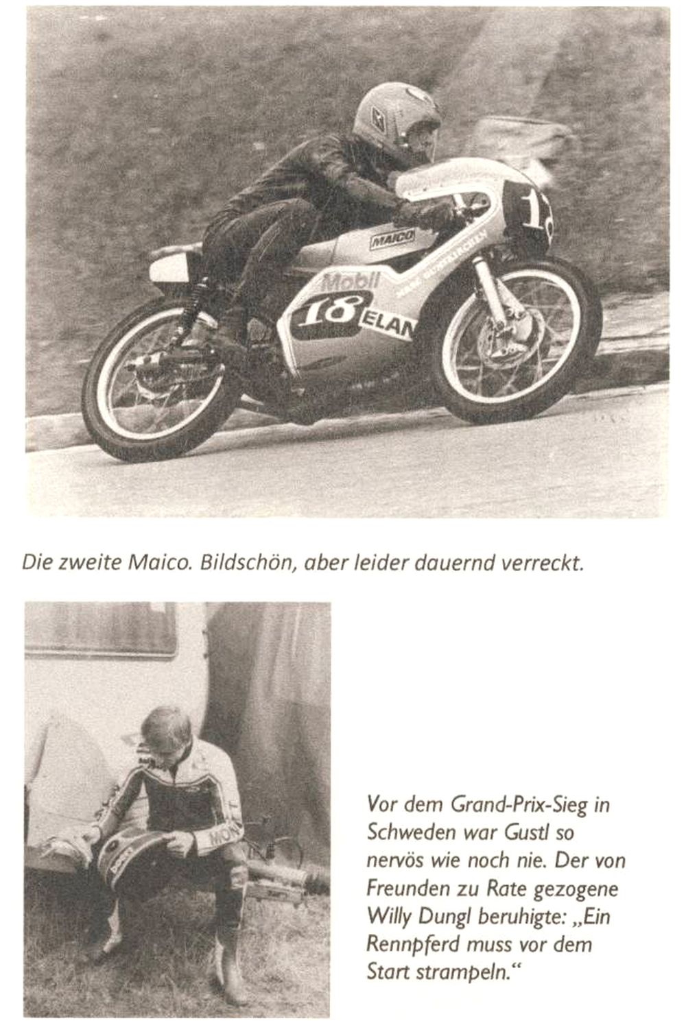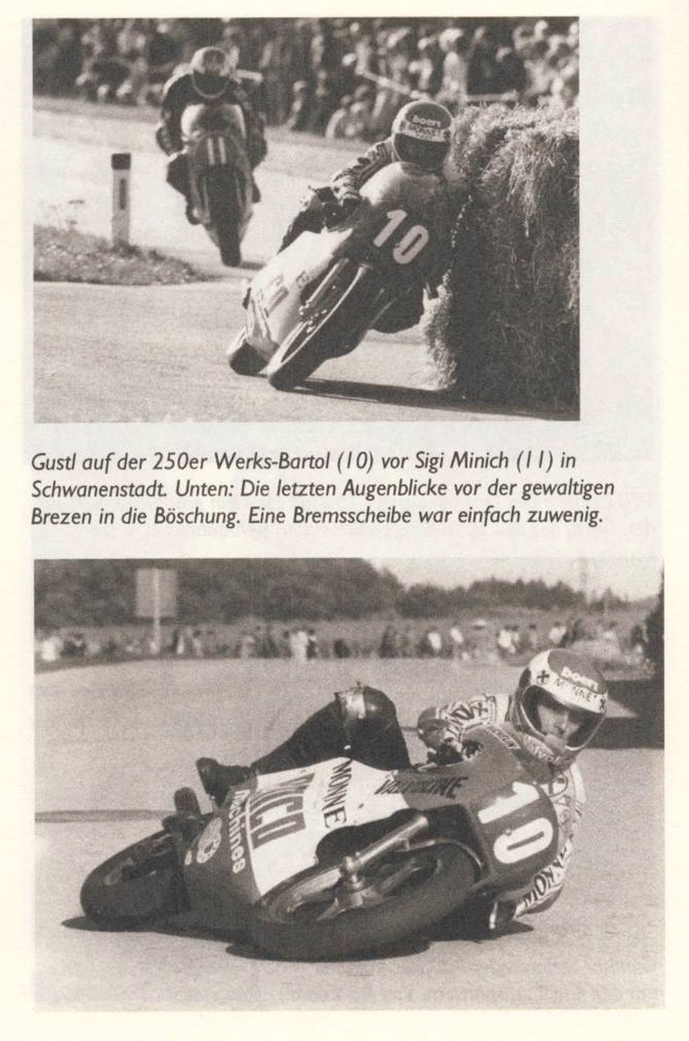 … Und Schwanenstadt war sowieso immer extrem wichtig. Der Kurs war eigentlich ein Rechteck mit einer relativ langen Start/Ziel-Geraden, die mit einer Schikane entschärft wurde, dann kam die sogenannte Bierzelt-Kurve, eine 90° Links, dann 400 Meter zur nächsten 90° Links, und dann eine richtig schnelle Partie mit schnellen Kurven durch die Obstgärten, gefolgt von der Einfahrt in die kleine Siedlung Kaiserett. Und die 90° Links dort hatte keine Auslaufzone, sondern frontal eine Böschung. 300 Meter weiter wartete schon die nächste 90° Links. Klingt nach mächtigem Ankerwurf. Der Bremse kam auf dieser Strecke große Bedeutung zu. Deshalb überlegten wir, ob wir vorne nicht zwei Scheiben verwenden sollten. Der Harald war ein großer Verfechter von einer Scheibe, weil zwei mehr Gewicht bedeuteten, ich selbst wollte diesmal eher zwei. Schließlich hatte auch der Minich zwei. Aber der Harald winkte ab. Eine wäre mehr als genug. Und? Wer hatte recht? Ich konnte im Training die schnellste Zeit fahren und mir die Pole sichern, aber ich hatte schon bemerkt, dass das mit der Bremse eine zache Partie war. Auf den langen Abschnitten kühlte die Bremse sehr gut ab und war beim Anbremsen der ersten Kurve richtig scharf, aber bei der zweiten – also nach der kurzen Geraden – ließ sie immer brutal nach. War ein denkwürdiges Rennen. Ein großer Fight. Der Sigi hinter mir. Aber ab der halben Distanz waren die zweiten Kurven fast nicht mehr zu derbremsen. Also ließ ich ihn überholen und wollte meine Bremse bis zur letzten Runde etwas schonen. Das war meine Strategie. Doch sie ging nicht auf. Als ich durch die Obstgärten das Loch nach vorne schloss, war ich vor der ersten Kurve bei Kaiserett tausendprozentig überzeugt, dass die Bremse voll einsatzfähig war, aber das war ein Irrtum. Ich griff auf die Bremse, und sie war nicht da. Sie war einfach nicht da! Null Wirkung. Verdammt! Hauseinfahrten, Garagentore, Gartenmauern, die steile Böschung, keine Bremse, und 170 km/h. Da muss man dann wirklich schnell sein in der Birne. Klar war, dass ich nirgends ungespitzt hineinkrachen durfte. Also – und das lief und läuft noch heute in mir in Zeitlupe ab – riss ich die Maschine um, ich legte sie nieder, in der vom Wunsch getragenen Annahme, dass sie sich Richtung Kurvenausgang drehen und parallel in die Böschung rutschen würde. Sie sollte als Dämpfer zwischen mir und der Böschung fungieren. Dann könnte ich weiterfahren. Unglaubliche Idee! Es ging weitgehend so auf, aber die Energie war halt unfassbar groß. Ich bin mit beiden Rädernvoraus in die Böschung geschlittert, dann hat es mich drübergeworfen. Ich bin richtig geflogen. Bis ich oben auf der Böschung landete. Ein unvergesslicher Moment. Ich kam auf den Füßen zu stehen, und die Zuschauer, die dort sehr nahe waren, schrien aus vollem Hals. Und ich dachte mir noch, dass das ja gar nicht so gut gewesen sei und diesen Jubel gar nicht rechtfertigen würde, da schlug neben mir das Motorradl, das extrem hoch aufgestiegen war, ein. Es war fetzenhin. Komplett zerstört. Das Federbein zum Beispiel ist durch den Reifen und die Felge gefahren wie ein Stanzwerkzeug. Die Technische Universität in Graz hat sich vom Harald dann das Wrack erbettelt, weil sie die auftretenden Kräfte untersuchen wollten. Gewonnen hat der Minich. Aber ich hatte ein Affenglück. Wenig später kam der schlimmste Unfall meines Lebens. Mit dem Auto. |
