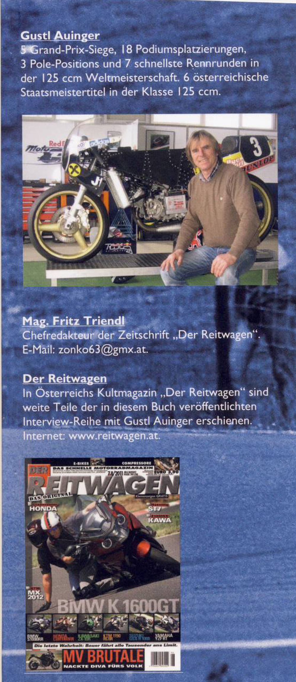 Bestellen kann man das Buch auch direkt bei Fritz "Zonko" Triendl unter Das Buch von Gustl Auinger ( mit Originalautogramm ) kann man bei Michael Sonnick bekommen. Es kostet 22,- Euro plus 3,- Euro Versandkosten Michael Sonnick, Motorsport-Bücher |