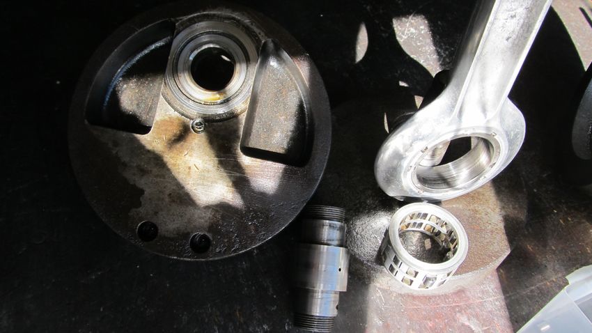 Beim Zerlegen des Motors kommen dann auch interessante Details zum Vorschein, z.B. Rollenkipphebel, ein sehr massives Alupleuel, angeschmiedete Hauptlagerzapfen - für Mitte der 30er Jahre alles durchaus anspruchsvoll. Zugleich aber auch Ernüchterung, der Motor ist offensichtlich voll Wasser gestanden. Die Kurbelwangen und die Zylinderlaufbahn sind total verrostet, das Pleuellager ausgelaufen, und die Kipphebellagerung verschlissen. Über defekte Lager und vermurkste Gewinde braucht man sich nicht weiter aufzuregen. Also das volle Programm. Nachdem alle Teile wiederverwendbar aufgearbeitet sind, wird es beim Zusammenbau interessant: Es gibt keinerlei Markierungen im ganzen Ventiltrieb zum Einstellen der Steuerzeiten. Es ist auch ganz egal, wie man die ganzen Zahn- und Kegelräder zusammenbaut, eingestellt wird nur (mit Hilfe einer Gradscheibe) durch Verdrehen der Nocken auf der Nockenwelle. Immerhin kann einer der beiden Lagerdeckel der Nockenwelle abgenommen werden, so dass man beobachten kann, wann sich die Kipphebel zu öffnen beginnen.