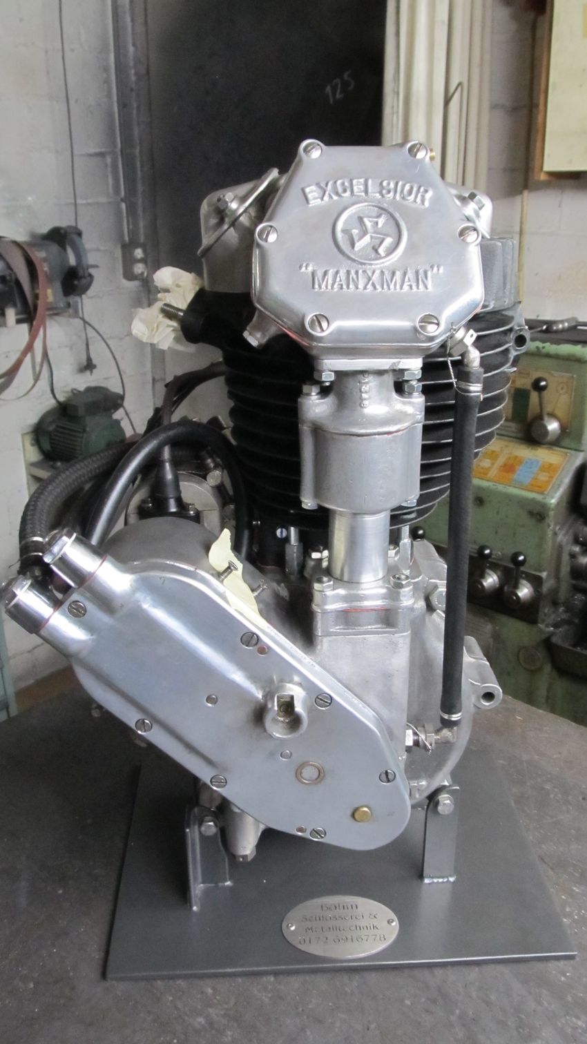 Horst hatte sich 2015 auf der Veterama eine hübsch aussehende 350er Excelsior Manxman von 1936 gekauft. Richtig, das ist ein Königswellenrenner aus England, etwas durchaus Edles, im Stil von Velocette und Norton. Nach längeren Diskussionen habe ich mich überzeugen lassen, den Motor zu untersuchen und ggf. neu aufzubauen. Da spielte natürlich auch Neugierde mit, wie die Engländer wohl diesen Rennmotor konstruiert hatten. Wobei die Excelsior Motoren (auch der berühmte vollradiale Mechanical Marvel) ja eigentlich bei der Firma Blackburne gebaut worden sind.