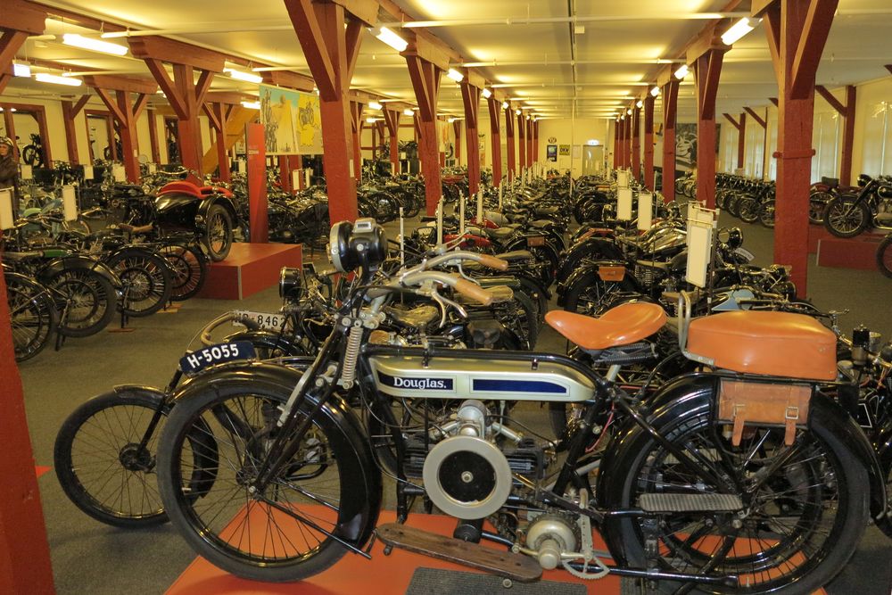 | ....und beim zweiten sieht man im Vordergrund einen englischer Douglas-Boxer aus den 20er Jahren auf einem Podest. Viele besonders wichtige und seltene Exponate hat man im Motorrad-Depot buchstäblich auf Podesten "hervorgehoben". |