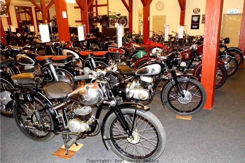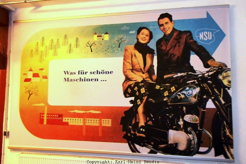 Diese frühe Nachkriegswerbung von NSU steht sinnbildlich für das Motorrad-Depot: "Was für schöne Maschinen....." Sie dokumentiert aber auch den damals - gemessen an der Gegenwart - komplett anderen Zeitgeist. Das Paar ist glücklich und zufrieden mit der kleinen ZDB 125, die in den frühen Nachkriegsjahren ein hohes Maß an Mobilität bescherte. Schließlich haben beide die grauenhaften Kriegsjahre und die anschließende Hungerzeit bis mindestens zur Währungsreform 1948 durchgemacht. Diese Vergangenheit sorgte für eine durchaus bescheidene, aber dennoch helle Perspektive für die Zukunft durch den Erwerb eines Motorrades, auf das heute leider viele "Fans" in Ermangelung des Faktenwissens über die damalige Zeit arrogant herabschauen. Das Motorrad-Depot liefert hingegen einen weiträumigen Blick über die verschiedenen Epochen der Motorrad-Entwicklung mitsamt des zugehörigen Zeitgeistes. Gerade deshalb - das kann jetzt schon gesagt werden - ist die Sammlung so ungemein wertvoll.