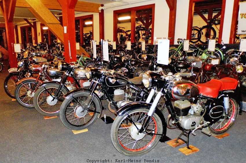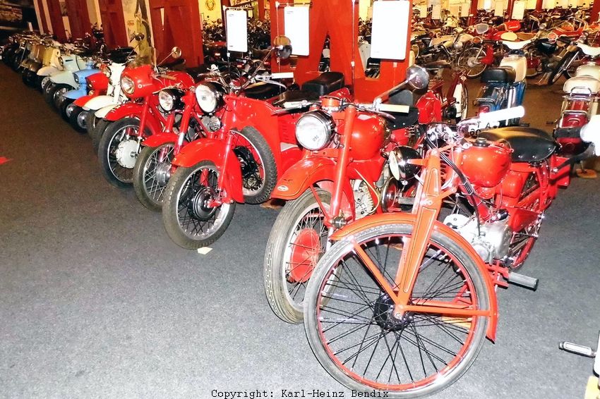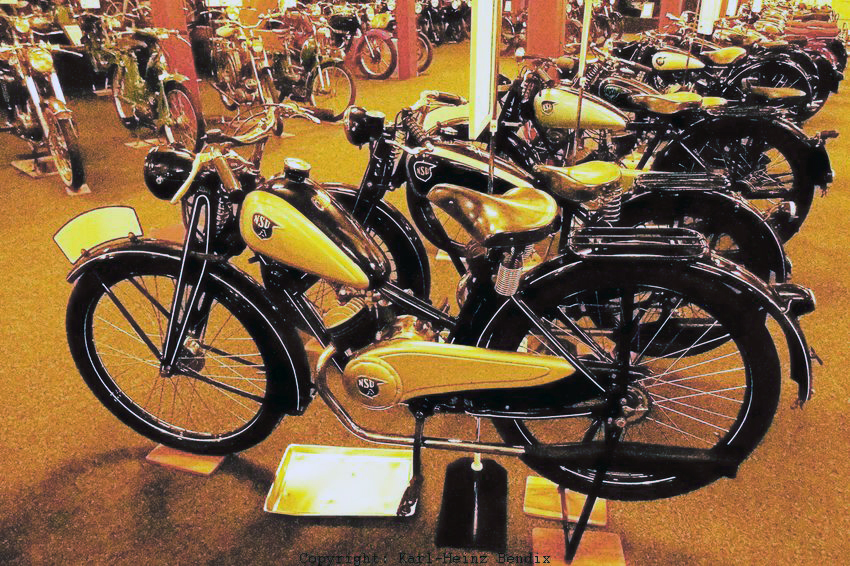 | Mitten im Raum ist eine beachtliche Gruppe der NSU "Brot- & Butter-" Motorräder platziert, zum Beispiel mit etlichen Vor- und Nachkriegsmodellen der 100er Quick sowie den anderen preiswerten Einsteiger-Modellen für - wie man damals sagte - "den kleinen Mann". NSU hatte die stets in seiner großen Modellpalette unterhalb der Luxusmodelle und der Mittelklasse. |