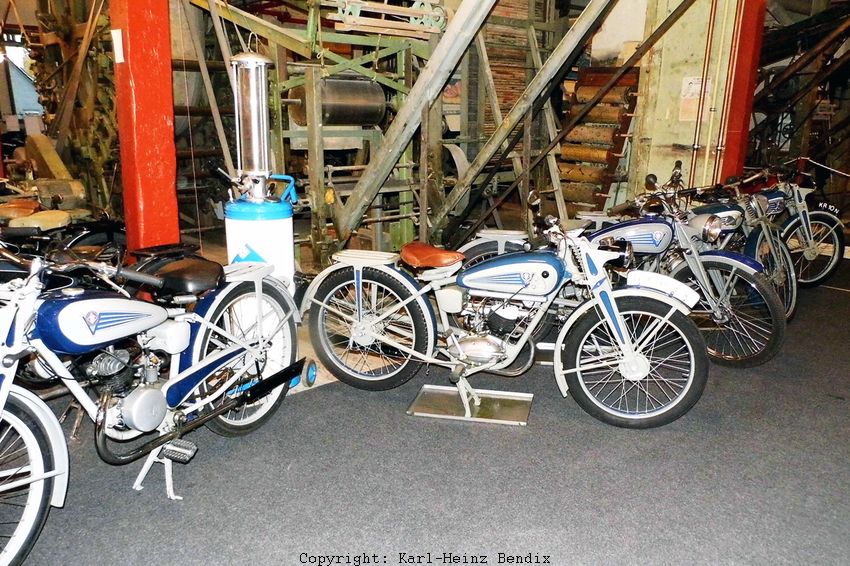 | Das preisgünstige Standard-98er MoFa von Victoria mit dem 98er F&S-Motor, das Modell V 99 Fix ist selbstredend auch vorhanden. Es steht mit einer Gruppe weiterer Konfektions-MoFas anderer Hersteller ebenfalls vor der historischen Tapeten-Druckmaschine. |
