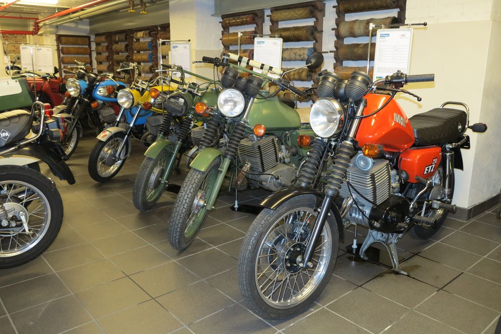 Ein ganzes "Geschwader" verschiedenster Modelle der Zschopauer Produktion aus den Zeiten der DDR erinnert an die Situation, dass es selbst in der Epoche der Glamour-Bikes im Westen Kunden für technisch möglichst einfach gestaltete, im Unterhalt preiswerte, zuverlässige Motorräder gab, die vom Zweck eher den Einspur-Nutzfahrzeugen der 50er Jahre glichen: MZ.