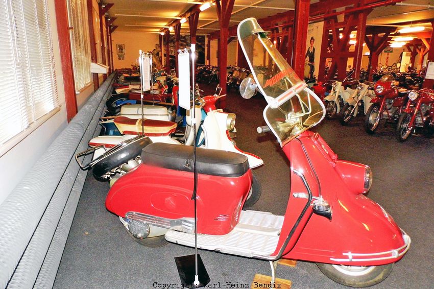 Im Nachkriegs-Italien entstand mit der Vespa und der Lambretta wieder ein neuartiger Typ motorisierter Einspur-Fahrzeuge. Die ökonomische Situation erforderte preiswerte "Nutzfahrzeuge" jenseits der motorisierten Fahrräder und MoFas, und so setzte sich erstmals das "Scooter"-Konzept durch. Zuvor hatte es immer wieder Ansätze zu solchen vom Motorrad-"Standard" abweichenden Konstruktionen gegeben (z. B. DKW Lomos und Golem oder Ner-A-Car), aber sie konnten sich am Markt nie durchsetzen. Das änderte sich mit den radikal anderen Konzeptionen von Vespa und Lambretta, die auf der Berücksichtigung der modernsten Fertigungs-Technologien basierten, die hauptsächlich aus der Militär-Flugzeug-Entwicklung während des Zweiten Weltkriegs stammten. Der sofort nach Erscheinen einsetzende Boom der Scooter in Italien führte unmittelbar zu einer weltweiten Welle von Scooter-Entwicklungen, bei denen viele innovative Ideen umgesetzt wurden, die aber einerseits nicht durchgehend sinnvoll waren, und die andererseits oft sogar den Markterfolg eher verhinderten als unterstützten. Im Motorrad-Depot gibt es etliche Exemplare des deutschen Roller-Booms der 50er Jahre. Dabei sind auch viele Exoten, deren Stückzahlen marginal blieben, und die schon damals im Straßenbild allenfalls lokal zu finden waren. Nach wenigen Jahren waren sie dann schon wieder komplett verschwunden. Hier kann schon bemerkt werden, dass besonders die Gegenwart dieser raren Stücke den Besuch für die Interessenten wertvoll macht, die sich dafür interessieren, was es schon alles an Konstruktionen gegeben hat, an die sich aber kaum noch jemand erinnert. |