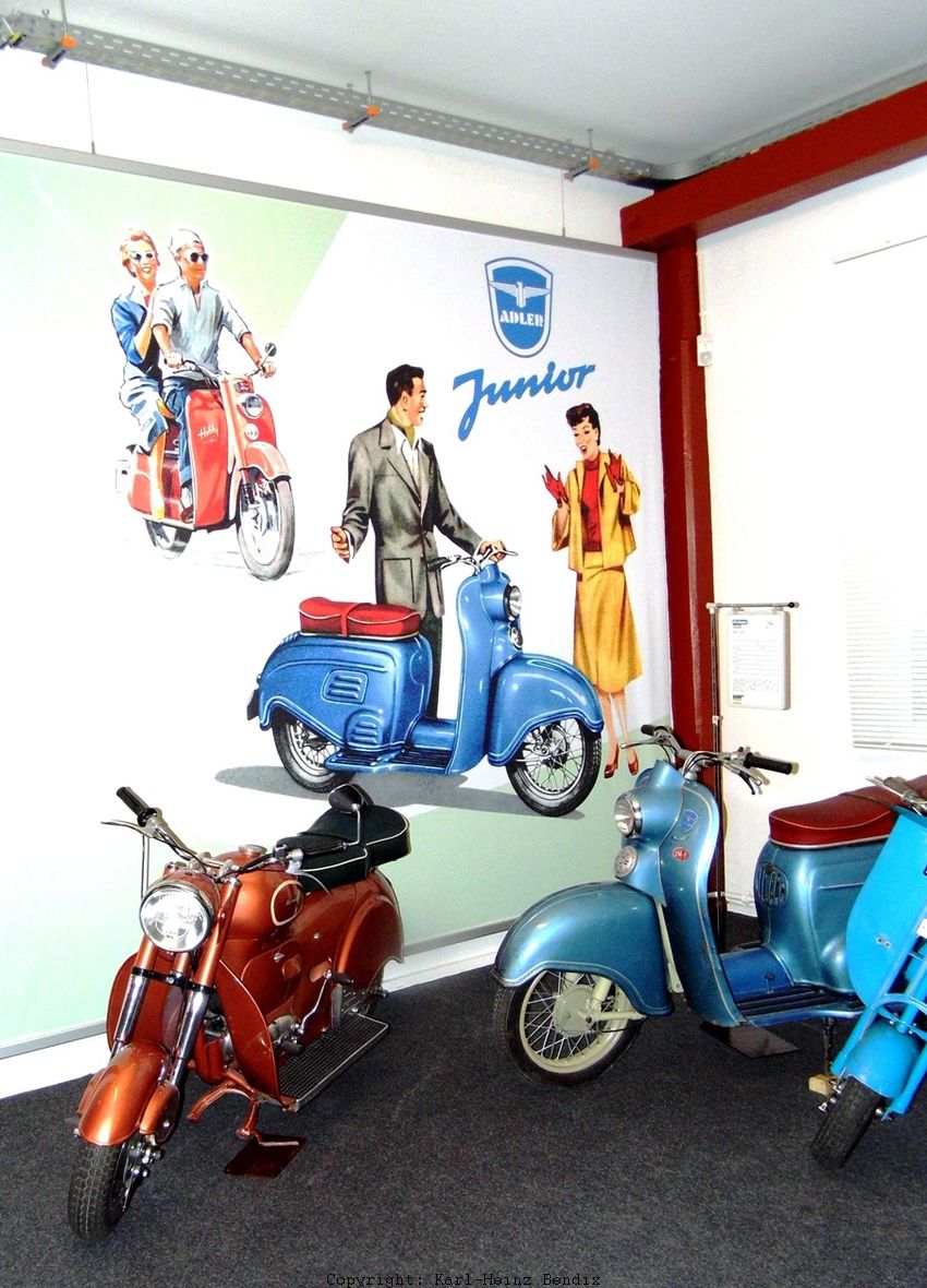 Achilles in Wilhelmshaven versuchte vergeblich, seinen "Sport"-Roller mit Motorrad-Attributen wie zum Beispiel der konventionellen Position des Tanks zum Markterfolg zu verhelfen. Auch modische Farben wie das hier zu sehende "Rost-Rot" haben eher zur Preisanhebung geführt als zu gesteigerter Attraktivität für eventuelle Kunden. Achilles-Roller in dermaßen vorzeigbarem Zustand sind äußerst rar. Einige der ursprünglich gut situierten Motorrad-Hersteller meinten hingegen zuerst, den Roller-Trend ignorieren zu können. Als dann der Markt in der Mitte der 50er Jahre kontinuierlich massiv schrumpfte, sahen sie in einem Roller-Modell den Strohhalm, nach dem man zum Zweck des Überlebens der Firma greifen konnte. So entstanden quasi mit Verspätung noch Roller-Konzepte der Traditions-Marken, die aber allesamt den Niedergang der ganzen Branche nicht mehr aufhalten konnten. Einige wie der Horex Rebell konnten gar nicht mehr in Serie gebracht werden, andere wie der hier rechts zu sehende Adler Junior mussten aufgrund der Einstellung der ganzen Produktion nach wenigen produzierten Exemplaren wieder aus dem Angebot verschwinden. An der Wand erneut ein Schritt weg vom Depot-Konzept zur didaktisch unterstützten regulären Ausstellung: Werbe-Grafiken von Adler und DKW, die den Zeitgeist der 50er Jahre hervorragend widerspiegeln.
