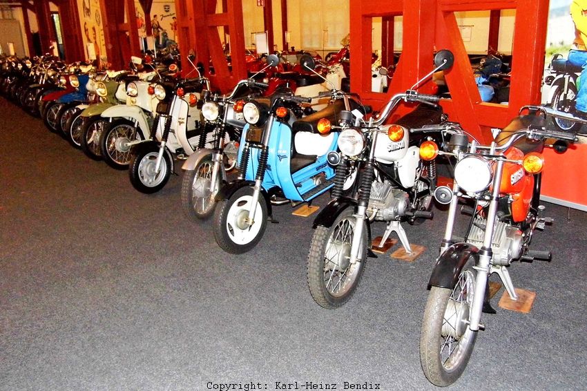 | .....wie auch eine umfangreiche Reihe der Mofas, Mopeds, Kleinkrafträder und Roller aus der DDR-Produktion von Simson/Suhl. Wer seinerzeit in der DDR aufgewachsen ist, wird hier alle seine damaligen Traum-Mopeds, angefangen beim SR1 über KR 50, Habicht und Schwalbe bis zu den späten S70 vorfinden. |