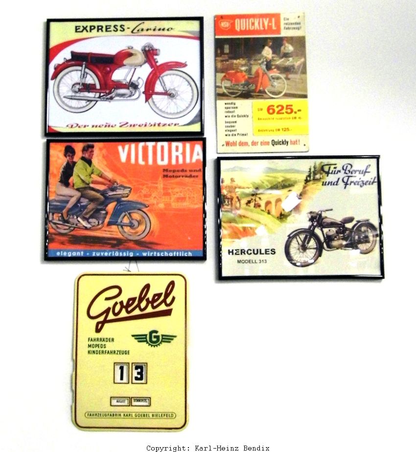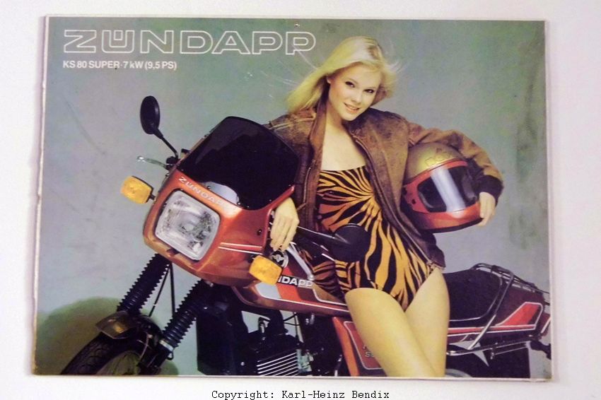 NSU hat seine Produkte intensiv beworben, zum Beispiel mit den Comics, für die Arthur Westrup lustige Texten verfasste. Die "fraßen" sich noch Jahre später in die Hirne der Fans, so dass sie noch Jahrzehnte später bei Stammtisch-Debatten zum besten gegeben wurden, wie zum Beispiel: "Nicht mehr laufen: Quickly kaufen!" Zündapp warb hingegen eher modern, oft nach dem Motto: "Ewig lockt das Weib!" Ein spätes Beispiel derartiger Zeitgeist-typischer Zündapp-Werbung findet man im Motorrad-Depot an der Wand. Oft hatten die Damen auf diesen Werbe-Fotos ein Motorrad-typisches Outfit. Hier hingegen meinte der zuständige Marketing-Mitarbeiter offensichtlich, dass die junge Dame darauf verzichten könnte. Immerhin besitzt sie einen Helm.