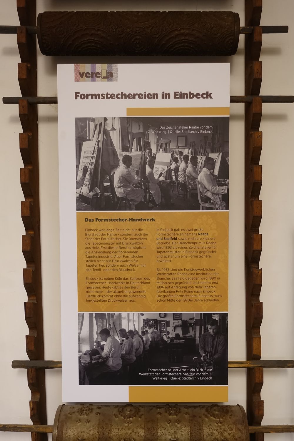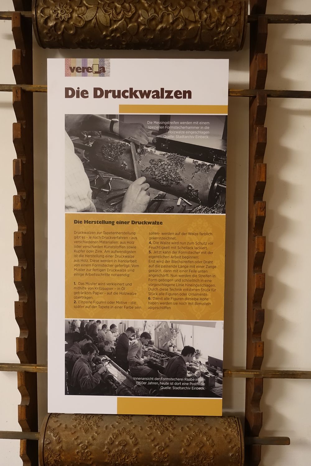 | Die zur seinerzeitigen Tapeten-Produktion gehörenden Maschinen und die damals zugehörigen Berufe werden mit Informations-Tafeln erläutert. |