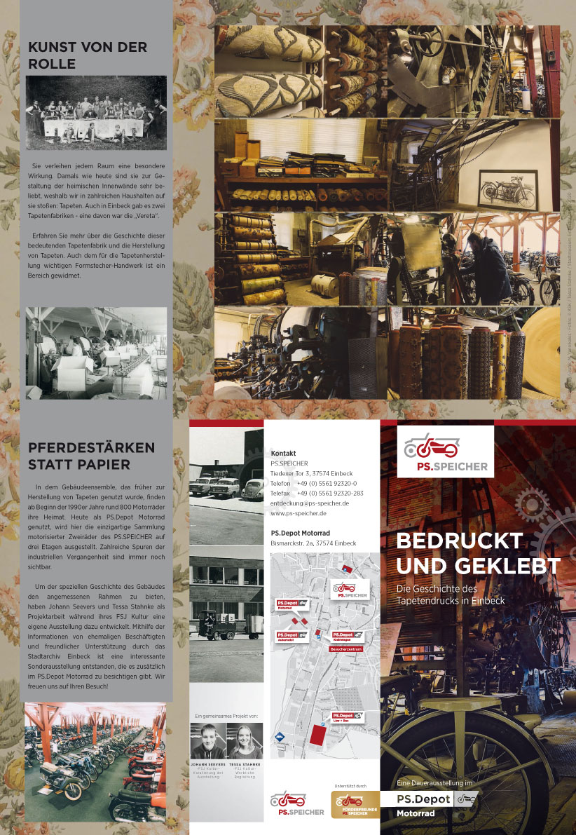 Zum Konzept der Depot-Ausstellung gehört es, dass die noch vorhandenen Maschinen der seinerzeitigen Tapeten-Produktion sowie die zugehörigen Werkzeuge - wie zum Beispiel die Druckwalzen - weiterhin vorhanden sind und über diese nun nur noch historische Produktionstechnik museal "berichten". Dadurch bekommt die Motorrad-Ausstellung ein ganz besonderes zum Gebäude gehörendes Flair, und sie wird damit intensiv mit der Einbecker Industriegeschichte verknüpft.