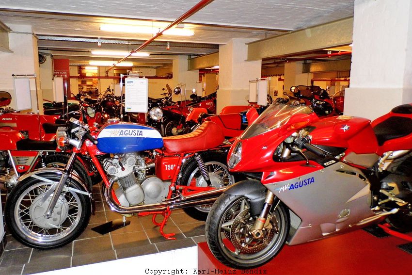| .......und weiter geht's mit den MVs, den älteren aus der Zeit der Original-Firma, die von der Familia Agusta betrieben wurde, und im Vordergrund sieht man auch ein Modell der von den Castiglionis neu gegründeten Firma mit dem traditionellen Namen. |