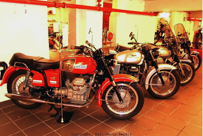 Auch die italienische Motorrad-Industrie litt mächtig unter den globalen Verkaufserfolgen der "großen japanischen Vier". Fast zwei Jahrzehnte hatten sich etliche italienische Firmen mit moderaten Hubräumen "über Wasser" gehalten und mit dem beginnenden Boom mit der Entwicklung von Big Bikes begonnen. Guzzi war mit der V7 mit so einem großen Hubraum zuerst am Markt und konnte damit ein völlig neues Image aufbauen. Hier steht eine Gruppe der im englischen Sprachraum "Bahn Burner" genannten Guzzi V-Twins im Einbecker Motorrad-Depot!