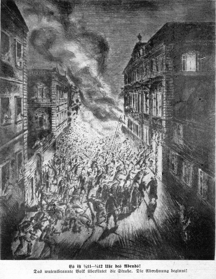 ca. 21 Uhr: Beim Abzug der Feuerwehr wird die Forderung laut, im Bezirksamt Feuer zu legen, was nun unter der Schussdeckung der Jäger möglich wird. Es werden aus den Fabriken und Lagern brennbare Stoffe herangeschafft wie Benzin, Schusterpech, Kleber u.a., die Scheiben im Erdgeschoss werden eingeschlagen und mit Fackeln ein Brand gelegt.