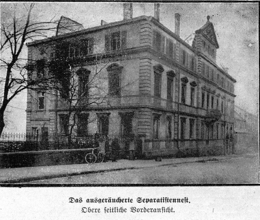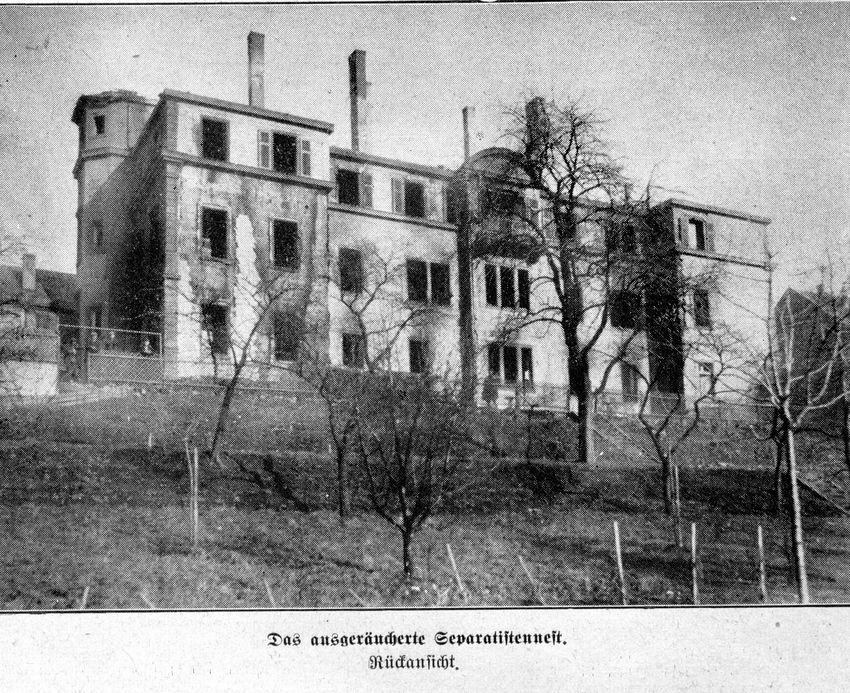 ca. 14 Uhr: Nach dem Aufruf des Leiters einer Abwehrgruppe, Albert Gießler, finden sich mit der Zeit einige hundert Pirmasenser am Verlagsgebäude ein um es abzusichern und in Sichtweite des Bezirksamts gegen die Separatisten zu protestieren.