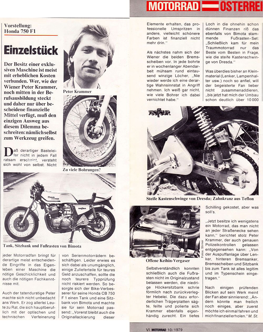 Zu dieser Zeit waren, so Krammer, zwar die leistungsstarken Zweitakter wie die Kawasaki 750 H2 recht angesagt, „für mich war damals aber wichtig, für alle Kategorien von Rennen etwas Passendes zu finden. Da war der Vierzylinder Viertakter einfach die Wahl – passte für Bergrennen gleichermaßen wie auf der Rundstrecke.“ Und hat gleich mit viel Enthusiasmus mit dem Umbau zu einer halbwegs renntauglichen Maschine begonnen. Was auch der damals in Österreich führenden Biker-Fachzeitschrift Motorrad eine eigene Story wert war. Krammer damals stolz: „Jetzt besitze ich wenigstens ein Motorrad, das man nicht an jeder Straßenecke sehen kann," zitiert ihn der Autor. Trotzdem konnte er auch genauen Polizeikontrollen gelassen entgegensehen: „Von der Auspuffanlage über Lenker, hinteren Bremsanker, Bremsscheiben und Sitzbank bis zum Tank ist alles legitim und im Typenschein eingetragen." Mit dem zumindest visuell so aufgemotzten Renner hatte Krammer geplant, alle Läufe zur österreichischen Meisterschaft der Klasse Seriensportmaschinen zu bestreiten – aber: „Nach der ersten Saison war klar – ohne echtem Motortuning hatte ich keine Chance.“ Also ist er mit seinem Motor zu Bernd Benecik – dem damaligen Motorenguru für die Hondas – gepilgert. Daraus wurde dann ein reinrassiger Yoshimura Motor mit allem, was es damals zu kaufen gab – 833 ccm, Schmiedekolben, Titanpleuel, Natrium gefüllte Titanventile, scharfe Nockenwelle Daytona, verstärkte Kupplung… Krammer rechnet: „In Summe habe ich damals ca. 100.000,- Schilling investiert. Dafür musste ich als technischer Zeichner viele Pläne an Wochenenden zeichnen – natürlich null Unterstützung von zu Hause.“ Doch so richtig waren keine besonderen Erfolge zu erzielen. „Ich bin halt dann immer so im Mittelfeld mitgefahren und entschloss mich schließlich doch auf eine reinrassige Rennmaschine umzusteigen“ – das war dann die Zeit einer Yamaha TZ 250.